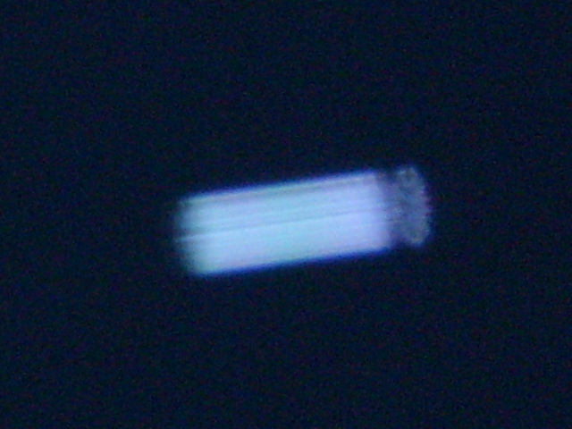 Das Objekt mit der Form einer Milchflasche oder Taschenlampe vermittelt uns eine pulsierende, sichtbare Energieform. Es wurde vom Blitz der Kamera erfasst und stellt sich für den Betrachter leicht unscharf dar. Das bedeutet: das Objekt befindet sich in einer schnelleren Bewegung als das Blitzlicht.